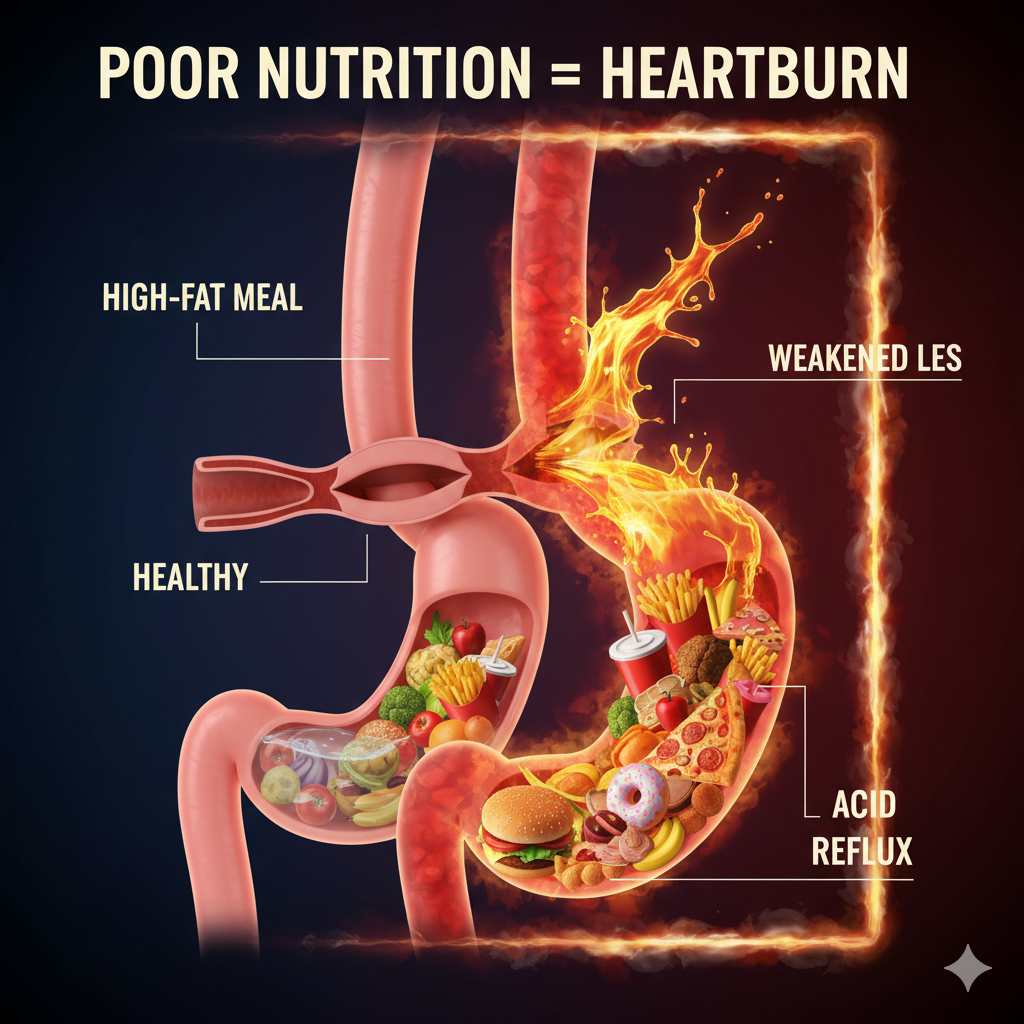 Poor nutrition forces your lower esophageal sphincter (LES) to fail. High-fat, processed meals act like a chemical "off switch" for this vital valve, leaving the gateway between your stomach and throat wide open for caustic fluids to rise.
