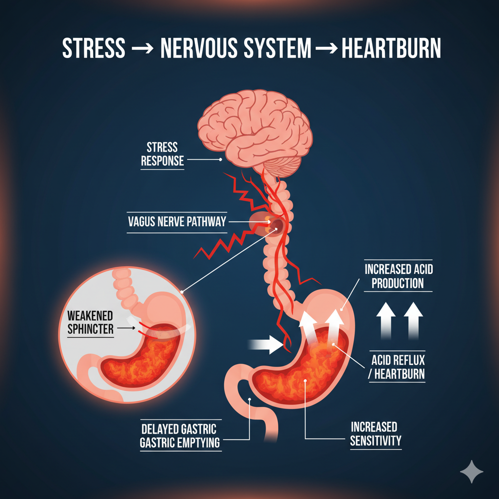 Essentially, when you're under pressure, your body isn’t just "feeling" stressed—it’s physically redirecting its resources. This internal shift creates a direct path for stomach acid to irritate your esophagus => heartburn!